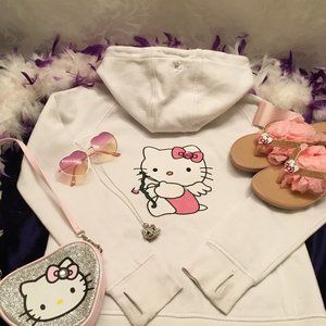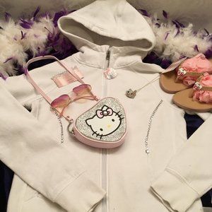 this hoodie is sooo cute! y2k style with the finger holes on the cuffs! vintage hello kitty on the back with crystal detail,note the logo is vintage so see pics there is slight line in the body but nothing u can notice and just adds to its vintage charm! zipper cute kitty charm and little embrodery flower with crystal at the top of the hood,the front features crystal details with a heart above each pocket!the size says large but as you can see the small mannequin wears it perfectly too,this is a special one of kind treasure! see my closet for the custom crystal hello kitty sandals the hello kitty crystal jeans . and many more items like this pls follow me for more to come daily! ask any questions i love to answer! note there is a sm mark on the cuffs but i did oxy them and they look even nicer reflected in price,the rest of the hoodie is bright white and brand new looking,i did only wear it once before the custom work was done!