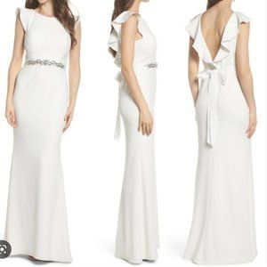 Fluttery cap sleeves and a ruffled open back bring movement to this sleek high-neck dress. Crafted from crepe with side seams on the bodice, it's chic and tailored; a crystal sash finishes the look.