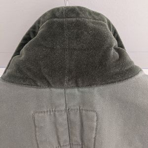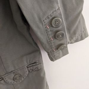 Olive green jacket with cute detailing, velvet trim under the neck, triple button detail at cuff, and adorable floral trim inside. Size small, american eagle, great condition.