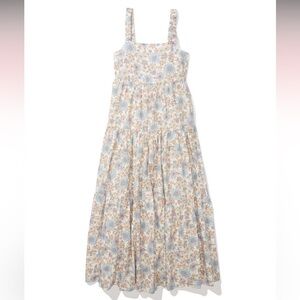 This elegant sundress from American Eagle Outfitters features a classic square neckline and a sleeveless design, perfect for casual resort wear. The maxi length and light, airy fabric make it an ideal choice for warm weather, while the white and blue color palette adds a fresh, summery touch.