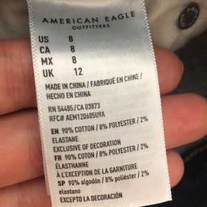 Dark wash high rise shorts from American Eagle Outfitters. Intentional distressing. Zipper fly, functional pockets on front and back.