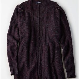 Beautiful rich purple, with touches of blue and red. Lace-up shoulder detail adds a little bit of something to a closet basic.