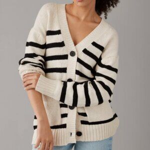 Cozy oversized cardigan from American Eagle. Features a chunky knit texture, open front design, and off-white base with black horizontal stripes. Soft, slouchy fit — perfect for layering.