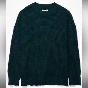 This cozy sweater from American Eagle Outfitters showcases a classic crew neck design in a versatile teal shade. Its chunky knit texture and relaxed fit make it perfect for staying warm and stylish during cooler days. The ribbed cuffs add a subtle touch of detail to this essential winter piece.
