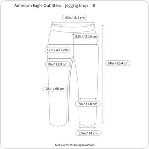 Features: AEO Denim, super super stretch, jegging crop, mid rise, zipper fly and button closure, belt loops, 2 front pockets, 2 back pockets, raw hem, medium dusty blue wash, casual, western, work, school, business casual