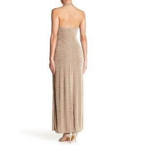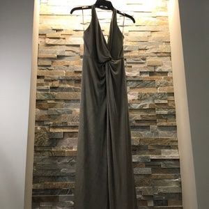 A twist front design and thigh-high slit complete the flirty look of this halter maxi dress with a plunging neckline.