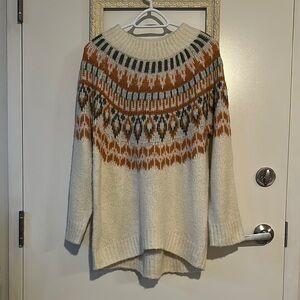 Slip into cozy comfort with the Aerie Pullover Knit Sweater, a perfect addition to your wardrobe for those transitioning days of fall, spring, or a chilly winter evening. With its classic cream Fair Isle pattern and tight-knit fabric, this sweater promises to keep you warm without sacrificing style. The relaxed fit and adjustable neckline ensure a comfortable experience, while the raglan sleeves add a touch of bohemian flair.