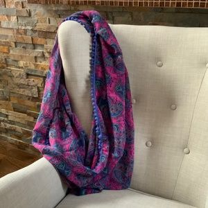 AERIE Pink Infinity Scarf in Pink Paisley Print with Purple Pompoms