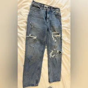 Not exact style as stock photo but very close. In great condition except the left knee hole is a bit more ripped than it was initially. Medium wash. Distressed throughout hem, rear pockets, and over the thighs. Have some stretch to them. Short length.