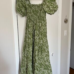 Lovely tiered smocked dress, green. print. EUC. Bump and nursing friendly.
