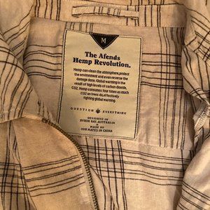 This is a men's AFENDS. double breasted, four pocket light shirt jacket. It's made with organic hemp and is lightweight.