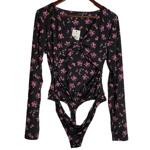 Features: Gimli Floral Long Sleeve Bodysuit in Noir Blush Floral, snap closure at bottom, soft and silky, gathered seam sits below neckline, V neck, cut outs, midriff bearing, cheeky bottom, sexy, revealing, casual