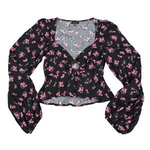 Modern charm defines this floral-print blouse styled with a playful front cutout and gracefully billowed sleeves.