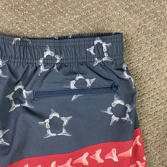 AFTCO Swim Trunks Shorts Men's XL Red Blue Megalodon Tooth All Over Print Lined