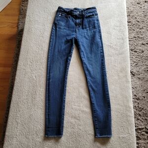 High rise dark wash skinny jeans with raw hem. In very good used condition