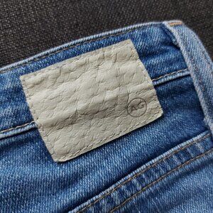 These high-rise tapered leg jeans from AG are heavily distressed (destroyed). No noted stains, or areas of excess wear. The rips are slightly more pronounced than they were from the factory distressing, but they still look great.