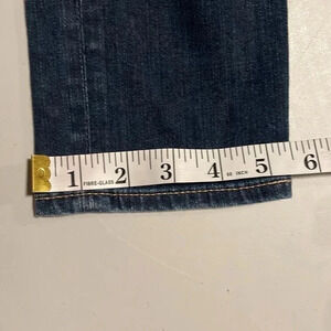Dark wash denim, " The Prima" cigarette leg jeans feature a five pocket design with belt loops. There is some factory distressing and considerable stretch available. These pants have a low rise and a standard button and zipper closure.