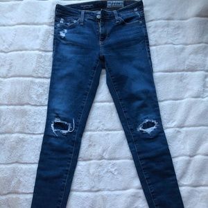 The streamlined skinny fit is in a dark wash with shredded knees.