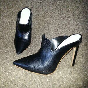 AGAIN&AGAIN-Stiletto Mules-Black Leather-Snakeskin Pattern-Sz 37-6.5US-NEAR MINT