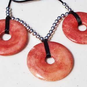 AGATE DONUT GEM NECKLACE, 3 LARGE DARK PEACH, 26 in. LONG, SILVER TONE BEADS ON BLACK SATIN CORD, TAG ON