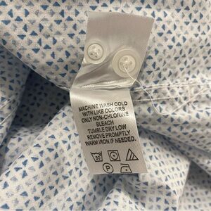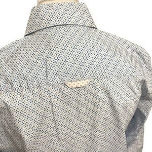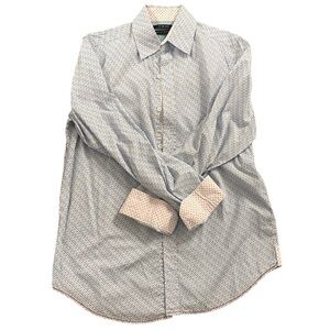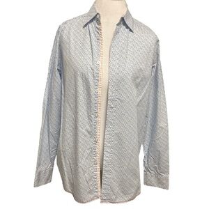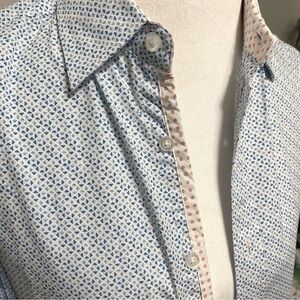 Age of Wisdom 100% Cotton Long-Sleeve Button down shirt. White with blue geometric design throughout, contrasting cuffs, inner collar and button piping in white with a red geometric design.
