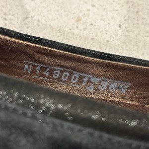 There's a tiny bit of sparkle around the hem of the shoe. The shiny silver aglets on the bow ties are branded. Rubber sole. Made in Italy. Great preowned condition.