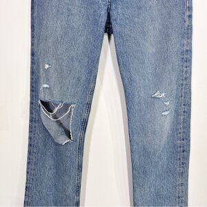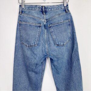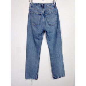 Vintage-inspired design, high rise, "pinch waist," button fly, and straight leg, tmade from 100% organic cotton with light fading and distressing.
