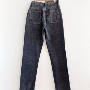 A streamlined take on a cult favourite, these are high-rise jeans with a straight silhouette, offset back waistband and a criss-cross button front. They’re made from non-stretch 100% organic cotton denim. This version comes in a washed black with a raw hem.