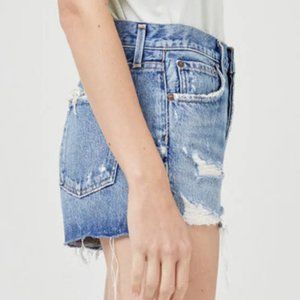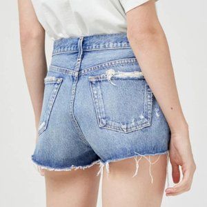 AGOLDE Parker Short in Clutch Blue. Made of organic cotton in a medium indigo wash. Featuring frayed hems, light whiskering and intentionally destroyed detail. 5-pocket styling, button fly, frayed hem, 100% organic cotton. Brand new, never worn, with tags.