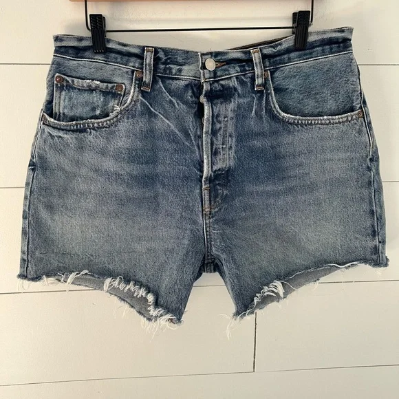 These high-rise jean shorts are designed with a slim-leg silhouette and a raw cut-off hem. Crafted in rigid cotton, the denim cut-offs are finished with a slim-leg silhouette and button fly closure.