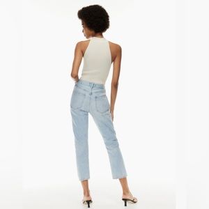 These are high-rise straight-leg jeans with a close fit. They’re made from non-stretch 100% organic cotton denim. This version comes in a light indigo wash with slight distressing, light whiskering and a finished hem.