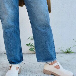 A cropped version of the iconic 90's jean. This mid-rise sits relaxed on the waist and has a raw hem and distressing to give it a worn-in and effortless look.