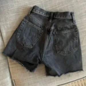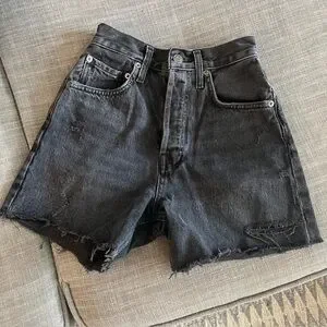 Washed black high rise jean shorts. Factory distressing. No flaws.