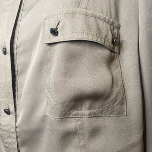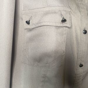 AK Anne Klein Gray, size 12, 100% Polyester. Beautiful shiny gray small buttons, two front pockets with button closure.