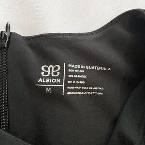 ALBION BLACK RUFFLE NYLON ELASTIC WAIST ROMPER, As described by ALBION : Squat, jump, dance, skip, or sprint in our new one-piece, black romper. Built like Albion Fit sprinter shorts on the bottom, this romper is the perfect length for movability and coverage. This casual romper has an elastic drawstring waist (plus pockets!) and transitions to a relaxed tank top. Trimmed with sweet ruffles and a zipper at the back this women’s romper is a NEED. Whether you're hitting the tennis courts, heading to the beach, or pairing it with cute sandals for a date, this is your go-to for easy, cute, and comfortable style.