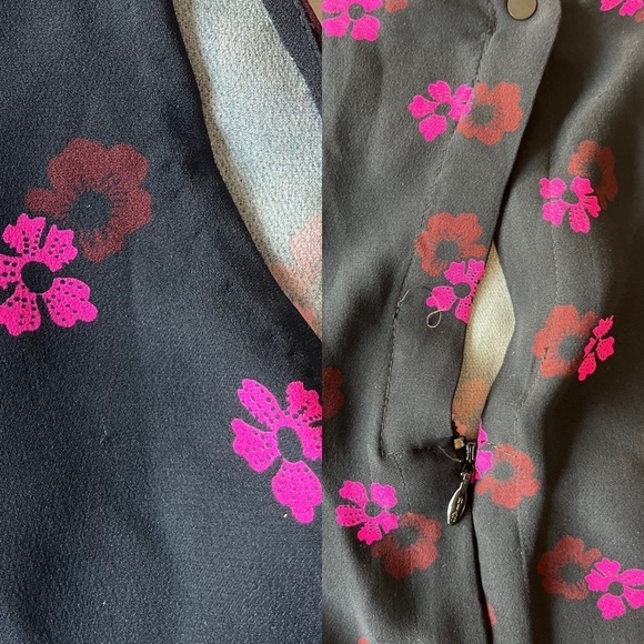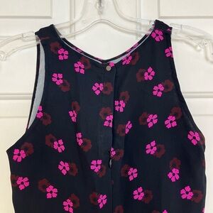 This sleeveless top is by A.L.C. and offers a pop of pink allover floral embroidery against a navy blue background. Fuchsia flowers are shadowed by a darker floral print underneath, creating interest & depth.