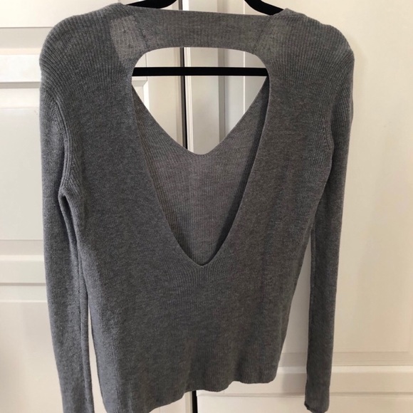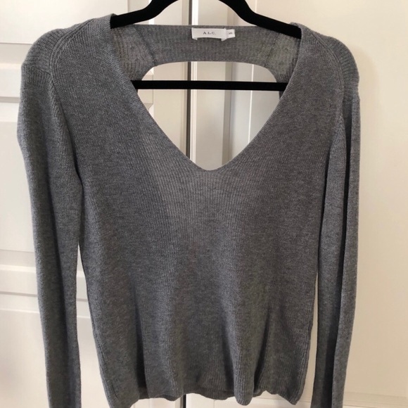 A.L.C Grey Ribbed Open Back Sweater Size XS. Super cute and edgy style! Perfect paired with a leather jacket, jeans, and heels. Or even worn overtop of a sports bra for a sporty look.