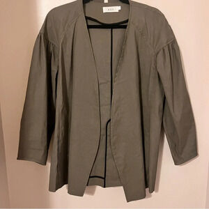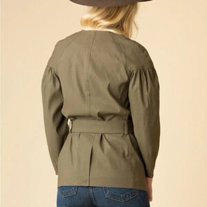 This jacket offers a sophisticated minimalism. A drop sleeve with a puff detail adds subtle volume while a belted, tie closure creates a classic feminine shape. In seam pockets and relaxed fit. 54% Linen 44% Viscose 2% Elastane.