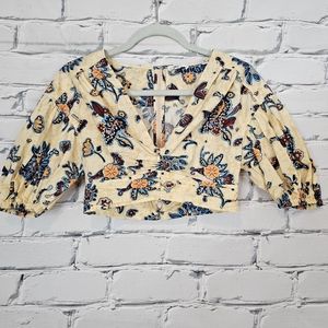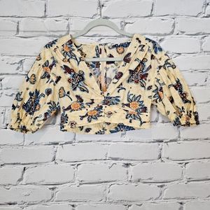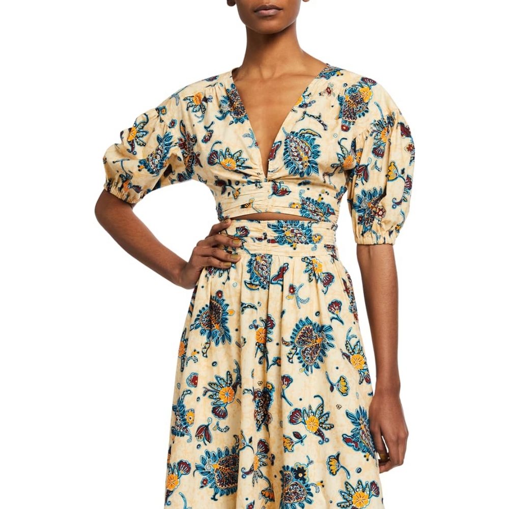 The Rylan top from A.L.C is a cropped top with V neck. It has puff elbow sleeves. It zips at the back with hook and eye closures at the bottom. It is in good used condition but has marker at the brand tag.