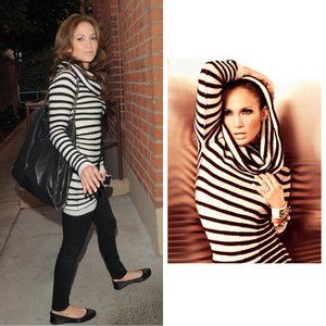 This cowl-neck sweater dress features raised stripes and raised seams. Asymmetrical hem. Ribbed banding at edges. Long sleeves. As seen on cover star Jennifer Lopez in Instyle Magazine September 2009. Perfect condition, no pilling, snags, discolouration, or stains. Dry clean only.