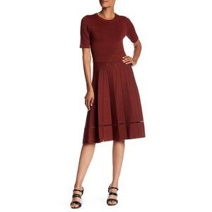 Refined knit dress featuring a tee-style bodice, elongated sleeves and crew neck. The dimensional pleated skirt features openwork vertical seams and a ladder-stitch inset along the hem. Slips on simply over the head.
