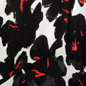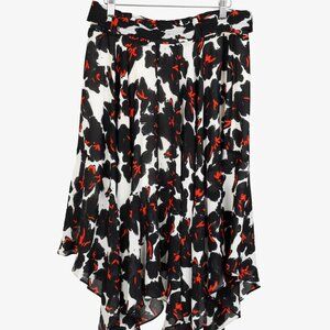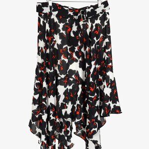 A graceful bias cut silk skirt from A.L.C., featuring a handkerchief hem and a bold black and orange accented floral pattern. Has an elastic waist with an adjustable trenchcoat-style belt for improved fit and styling.