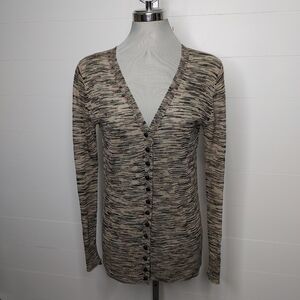 Lightweight and semi sheer cardigan with buttons on the front and the back. There are a couple very minor unnoticeable pulls in the knit and one cuff has been repaired (see photo). In otherwise good condition.