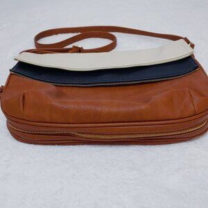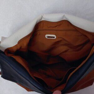 ALDO Black, tan and cream, golden hardware, long adjustable strap, 3 inside pockets, one with a zipper, big crossbody bag. You can even make it wider by unzipping the button. Great pre-loved condition, one tiny scratch as shown on the picture.
