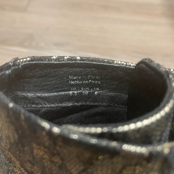 ALDO boots in like NEW condition (NO damage, scuffs, stains). It is a Gorgeous boot perfect to spice up any outfit! Size: US 8.5 (EUR 39) Colour: Gold and Black Material: Leather with embroidered black Lace Details: Wooden Block Heal, Platform