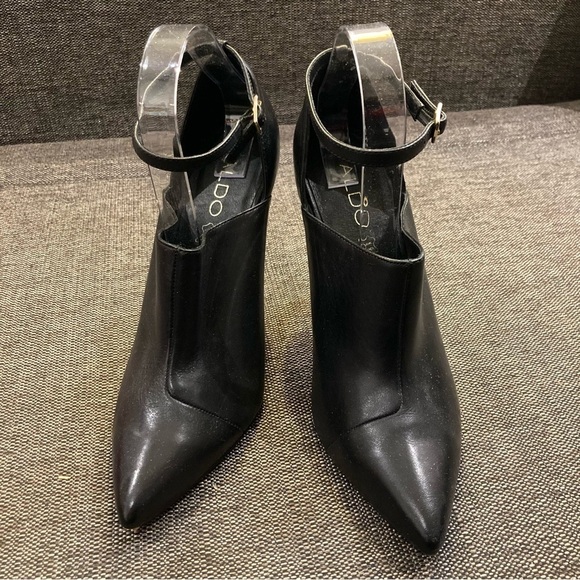 ALDO Sz 9 Pointy Toe Cap Leather Ankle Strap Shoetie 4” Heels Shoes. Beautiful and classy. No size tag but they are mine and they are true to size. Edgy and fun. Dress up or down.