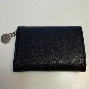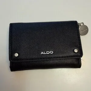 Compact fold wallet by ALDO. Pebbled black exterior with silver logo and hardware. Snaps and zip charm for secure storage. Multiple compartments for cards and cash. Non smoking home.