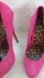 The exterior of the shoes is a vibrant fuchsia or hot pink color, appearing to be made of a suede-like material.