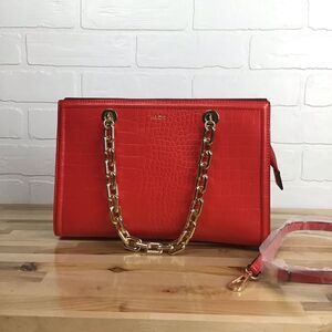 Great red purse! New without tags. The plastics are still on the zippers ! Some minor marks due to storage! See pictures! Very heavy chains! Great quality!