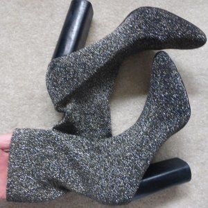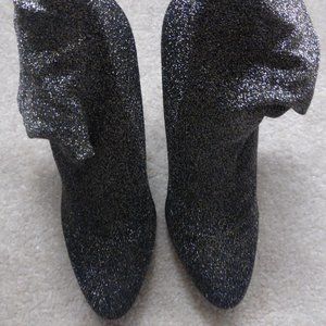 In very good condition! Lots of life left in these cute boots! Soft, stretchy metallic knit fabric. Some scuffs and marks. Minor snags, but not noticeable. Nice pair of boots for your next night out, date night, party or event